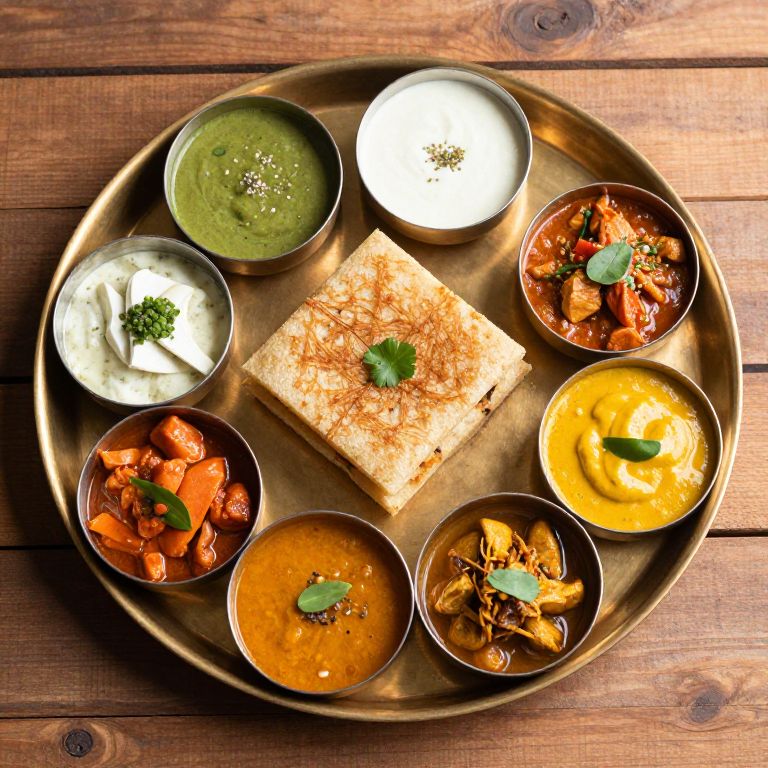 Gujarati thali with a variety of traditional dishes beautifully arranged on a brass platter, including dhokla, thepla, kadhi, and farsan, rustic wooden table background, top-down view, detailed food textures and authentic colors in hyper-realistic style