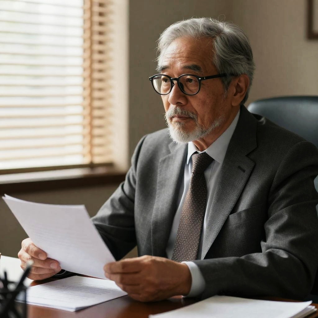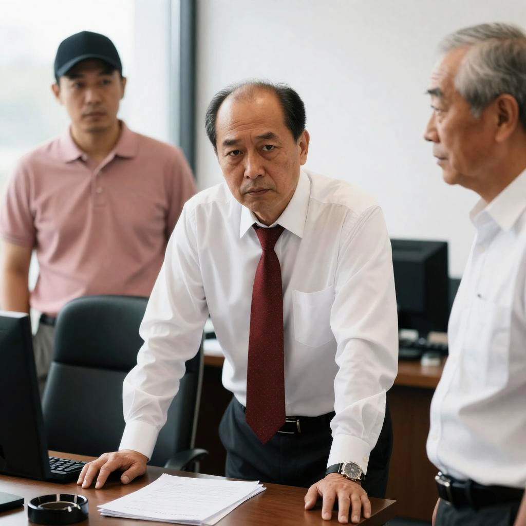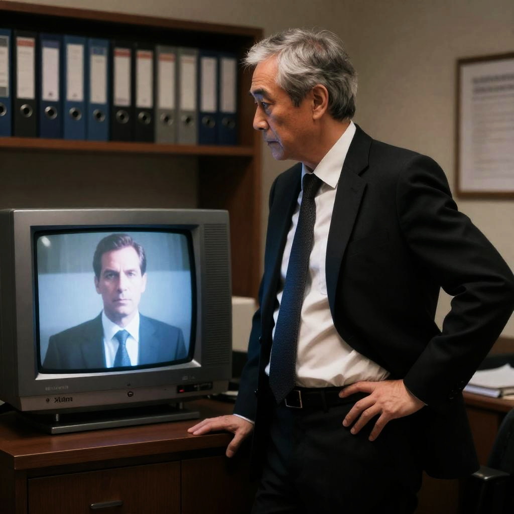 Middle-aged man with gray hair in black suit and tie, hands on hips, staring at old CRT TV showing another man in a suit. Background has office shelves with binders. Man on TV looks serious. Room is dimly lit.