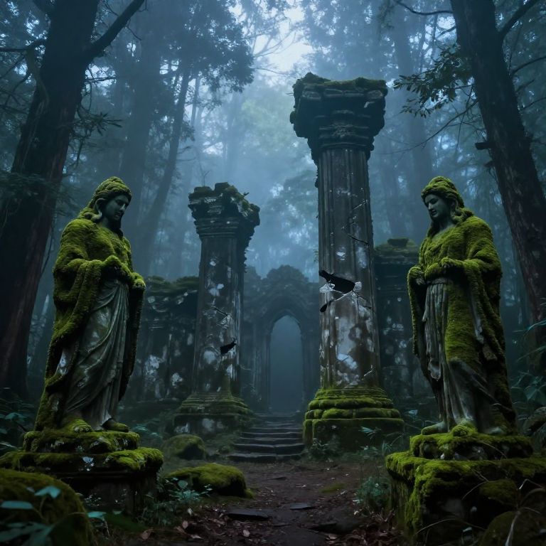Dark ruins deep in an enchanted forest, moss-covered statues and cracked pillars surrounded by dense fog and ethereal blue light, mystical and abandoned ancient architecture