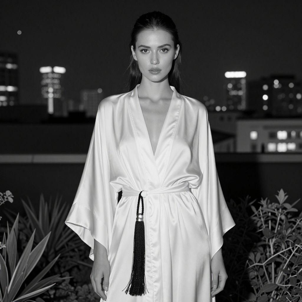 A poised black and white fashion muse with glowing skin, sharp facial contours, and neutral brown eyes stands in a moonlit rooftop garden, dressed in a flowing white silk robe with a black tassel trim, the city skyline behind her illuminated in soft shadows, capturing the ethereal and elegant essence of monochrome fashion.