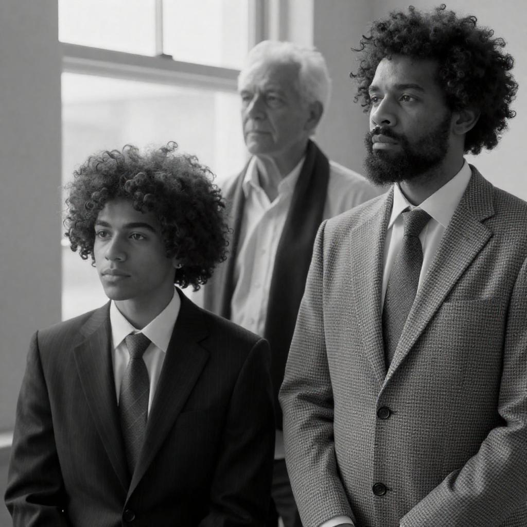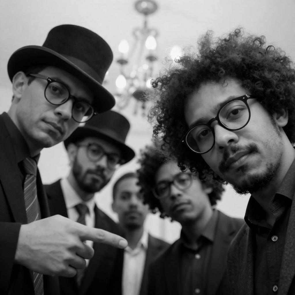 Black-and-white photograph of five men with glasses, top hats, and afros. Foreground man with afro and glasses on right, leaning towards camera. Background man with top hat and glasses on left, pointing. Overhead chandelier. Mid-ground men, blurred expressions. Close-up, low angle.