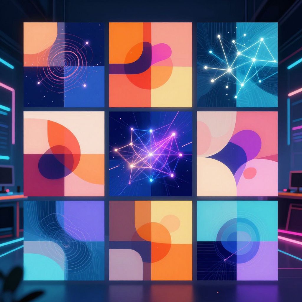 Image mixer AI transforming abstract art pieces into vibrant digital collages, showcasing seamless blending of colors and shapes, futuristic neural network style with glowing light effects and high detail, in a cyberpunk studio environment.
