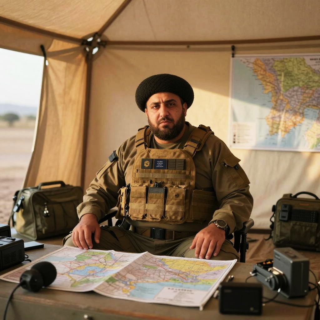 Obese ISIS leader seated at a rustic command tent, surrounded by maps and communication equipment, wearing tactical gear, under warm sunset hues.