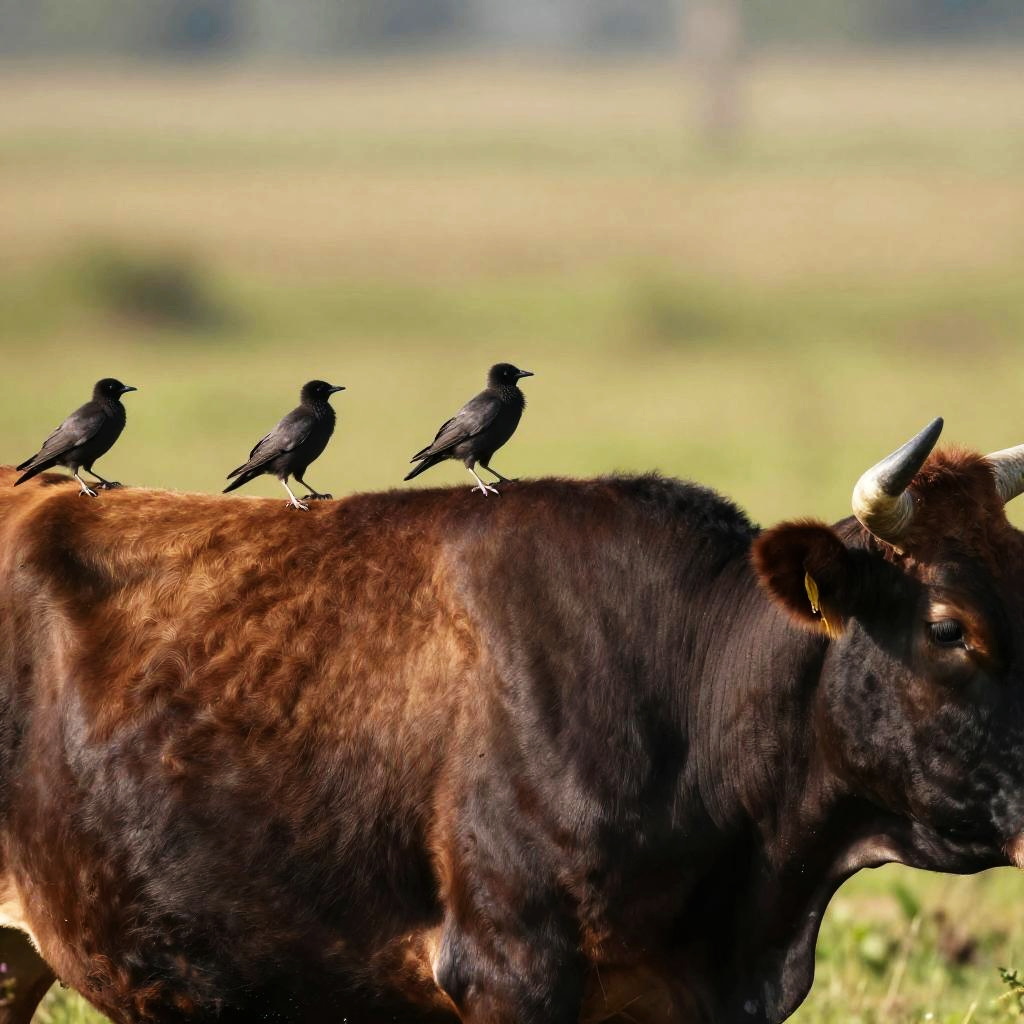 Photograph of a close-up side view of a dark brown, large-horned cow with three small birds perched on its back. The cow's textured hide shows subtle shading and the birds are dark with small beaks. The background is blurred with soft green and yellow hues, suggesting an outdoor grassy area. The image has a faint watermark overlay.