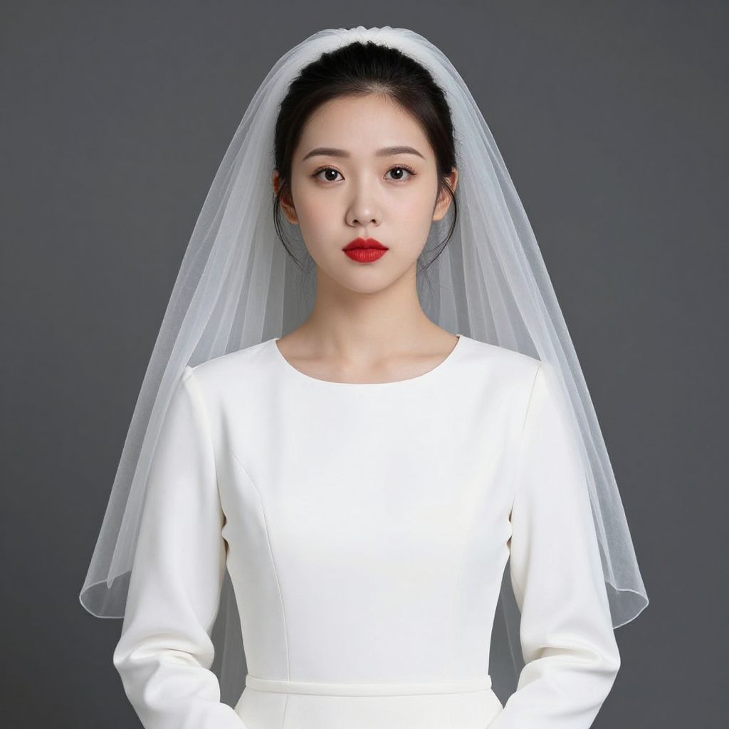 Widow bride costume, 1girl, solo, looking at viewer, realistic, dress, white dress, long sleeves, red lips, veil, closed mouth, asian