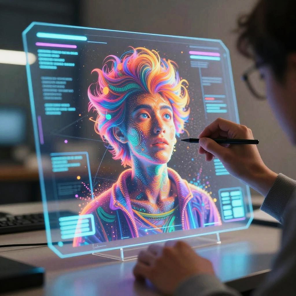 A digital artist creating a text to avatar representation on a holographic screen, vibrant colors, blend of sci-fi and fantasy elements, futuristic workspace filled with glowing interfaces, soft lighting, expressive and dynamic avatar emerging from textual data