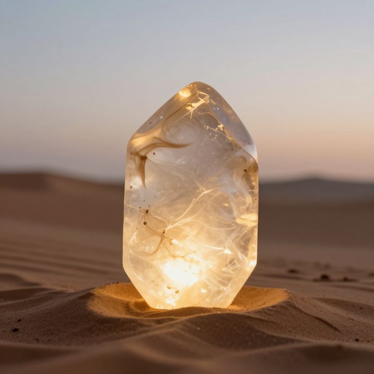 In the desolate expanse of the desert, a luminous philosopher's stone stands as a beacon of untapped potential, its radiant glow casting whispers of hope and contemplation, while the soft hum of the wind carries the promise of transformation and the eternal quest for meaning.