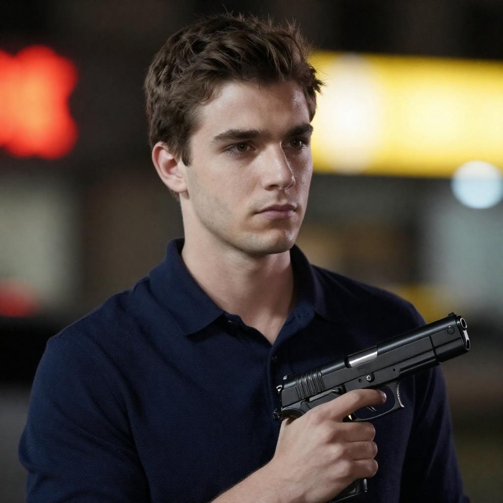 Photograph of a young man with short brown hair, wearing a dark blue shirt, holding a black handgun in his right hand. He has a serious expression, looking slightly to the left. The background is blurred, featuring bright red and yellow lights, suggesting an urban nighttime setting. The image has a dramatic, high-contrast style.