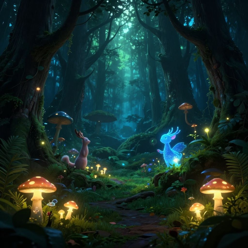 Tiko, an enchanting forest filled with bioluminescent plants and glowing mushrooms, mysterious creatures peeking from behind ancient trees, soft mist hovering over the ground, and a winding crystal-clear river reflecting the magical light, fantasy art style.
