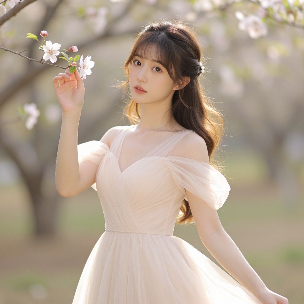 Photograph of an Asian woman with long, wavy brown hair and bangs, wearing a white, off-shoulder, V-neck dress with puffed sleeves. She holds a small, white flower in her right hand, raised near her face. The background is a sunlit, blurred orchard with trees and blossoms, creating a soft, ethereal glow. Her expression is gentle and slightly dreamy. The dress's delicate fabric and the flower's soft petals contrast with the natural, outdoor setting, adding a romantic, serene atmosphere to the image.