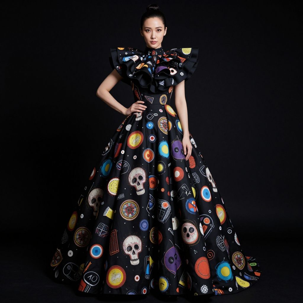 Photograph of a slender, dark-haired woman with a high bun, wearing an elaborate, full-length, black and white patterned gown with a dramatic, fan-like collar. The dress features a wide array of bold, colorful geometric and abstract designs, including circles, squares, and skulls. She stands confidently against a plain, dark gray background, her left hand resting on her hip, exuding a strong, fashion-forward vibe.