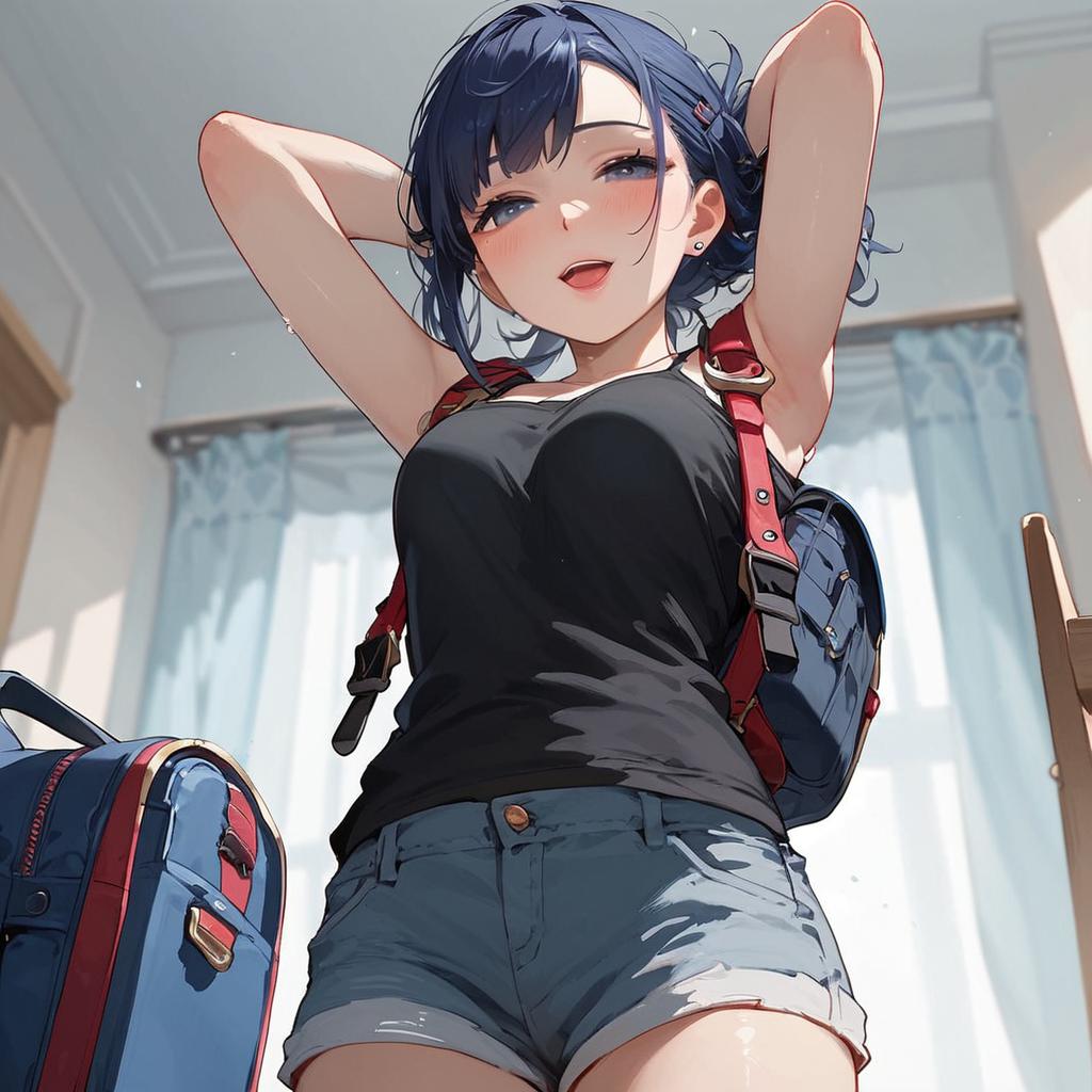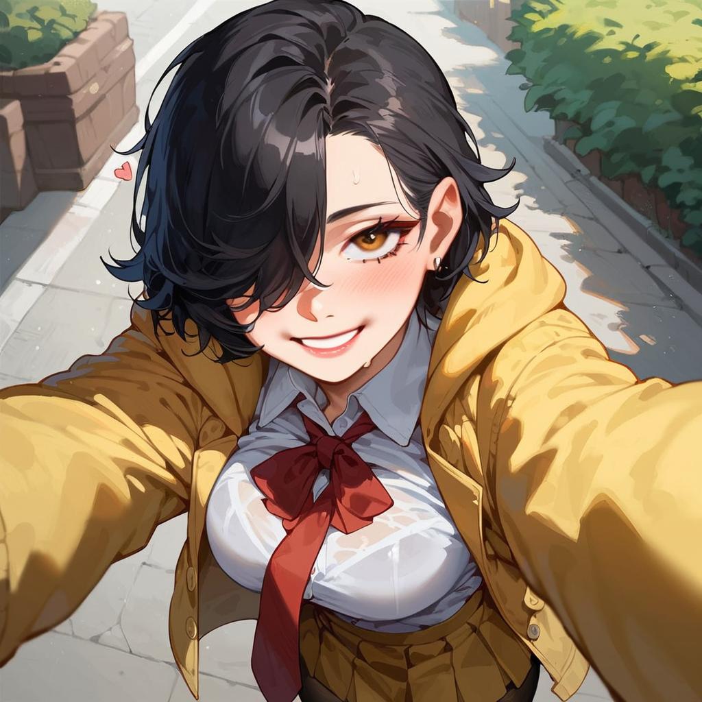 A digital anime-style illustration of a cheerful young woman with aqua blue short hair wearing a red hairband. She is dressed in a vibrant yellow jacket and matching yellow skirt, black pantyhose, and a black belt. The character is holding a black bag and smiling directly at the viewer while taking a selfie from above, showcasing her blue eyes and expressive facial features. The background shows a simple indoor setting with neutral colors.