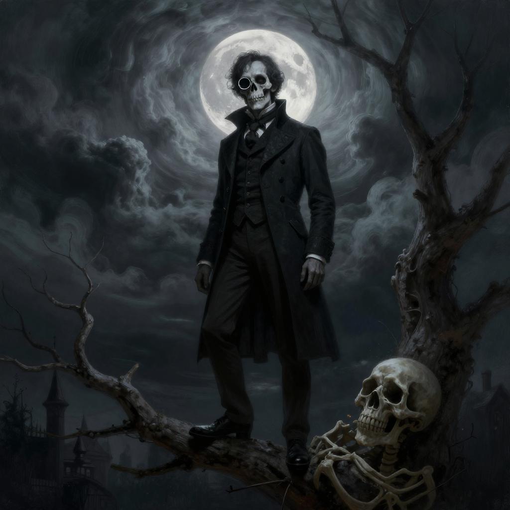 A surreal, gothic-style digital painting of a tall, eerie librarian with a skeletal face, dressed in a Victorian black coat, tiny waistcoat, and a monocle. He stands perched on a curved, skeletal tree branch under a swirling stormy sky illuminated by a glowing full moon, creating a dark and mysterious atmosphere.