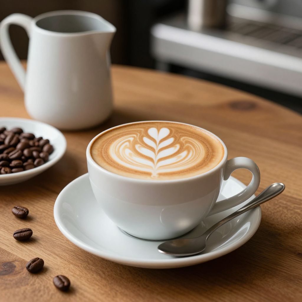 In this captivating image, a beautifully crafted latte art sits elegantly in a intricately designed cup, its creamy foam forming a delicate, symmetrical pattern reminiscent of a flower. The cup rests on a saucer, accompanied by a spoon, all set against a warm, wooden table that exudes a cozy ambiance. To the left, a white pitcher and a plate of coffee beans add to the rustic charm, while a blurred background hints at a modern, well-lit space. The lighting is soft yet dynamic, casting gentle shadows and highlighting the rich textures of the cup and saucer. The overall composition is balanced, with the latte art as the focal point, surrounded by elements that enhance its visual appeal. The scene is a harmonious blend of modern and traditional elements, captured with an ultra-realistic, photorealistic quality that makes every detail stand out.