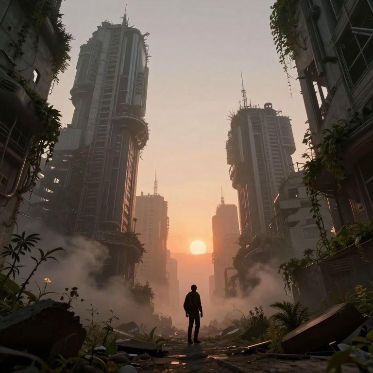 A post-apocalyptic cityscape regenerating from devastation features towering structures emerging through hazy smoke. In this digital art-inspired scene, an individual solitary traveler is silhouetted against the gentle radiance of an otherworldly sunset. The perspective mirrors a 'bug's-eye view,' revealing intricate details of technology intertwining with nature as vines and vegetation start to reclaim the deteriorating concrete. This visual narrative evokes both melancholy and anticipation for renewal, capturing the breathtaking yet haunting allure of this world in transition.