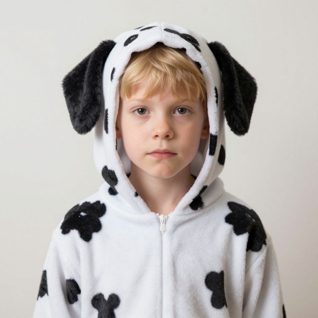 Boy dalmatian costume, solo, realistic, male focus, animal costume, looking at viewer, 1boy, blonde hair, hood, upper body, lips, blurry, closed mouth, kigurumi