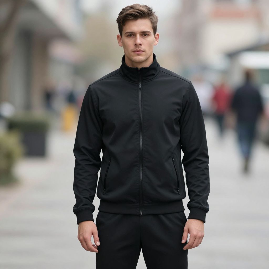Photograph of a young Caucasian man with short brown hair, wearing a black zip-up jacket and black pants, standing on a blurred urban street.