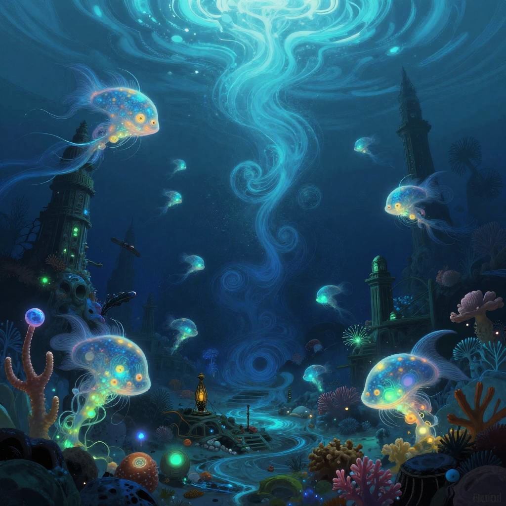 Desine themed illustration of a serene underwater city built into coral reefs, bioluminescent sea creatures swimming through glass domes and intricate tunnels, coral towers adorned with glowing symbols, evoking a peaceful and magical atmosphere.