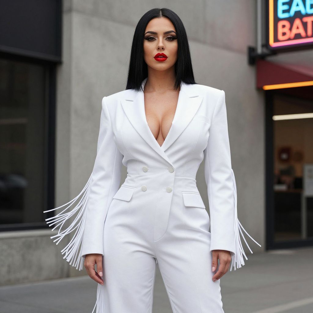 A bold, confident woman with straight black hair and a bold red lipstick stands in a modern urban streetwear setting, dressed in a sleek white fringe costume with sharp lines and asymmetrical design. The fringes are slightly exaggerated for a dramatic effect, contrasting against the minimalist concrete and neon signs around her.. The woman has big tits and cute face
