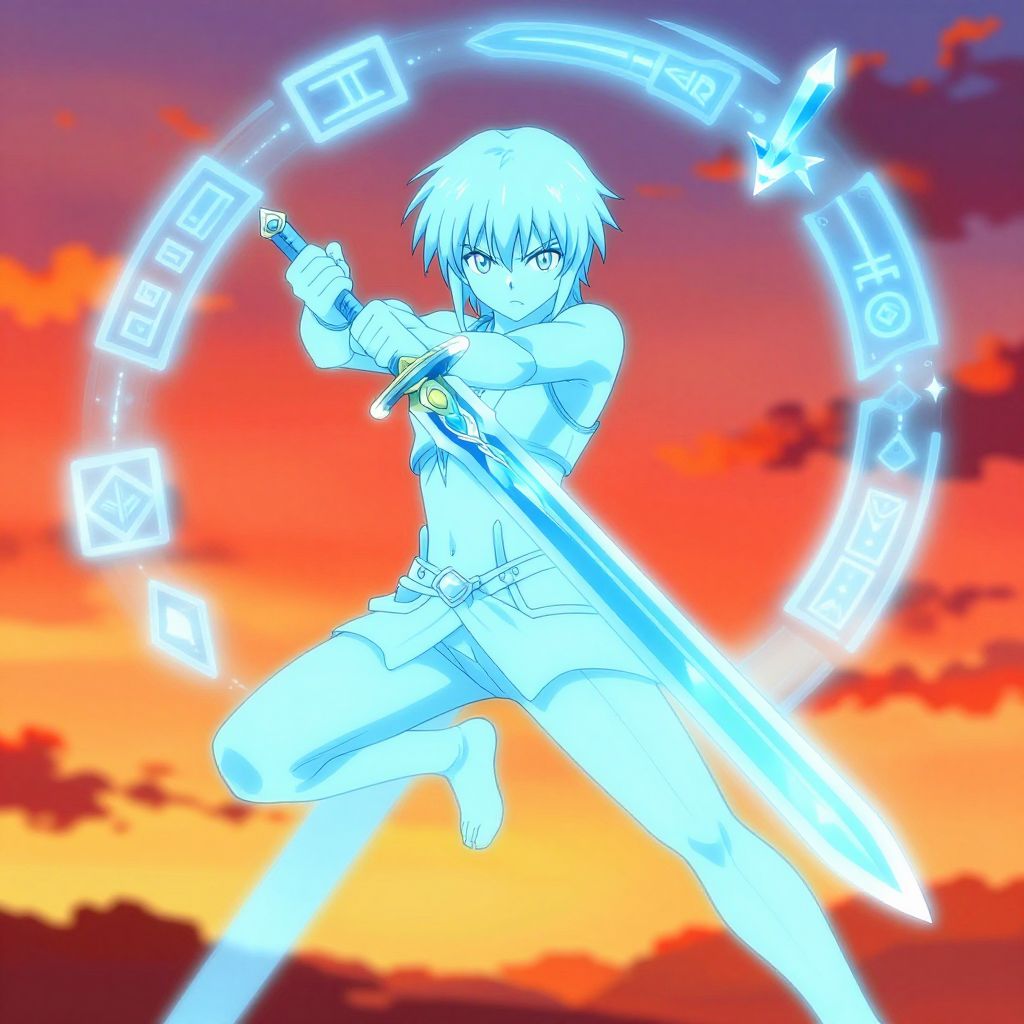 Light blue anime character wielding a crystal sword, surrounded by floating magical runes, set against a vibrant sunset sky, dynamic pose, sharp and clean linework, high contrast between character and background.