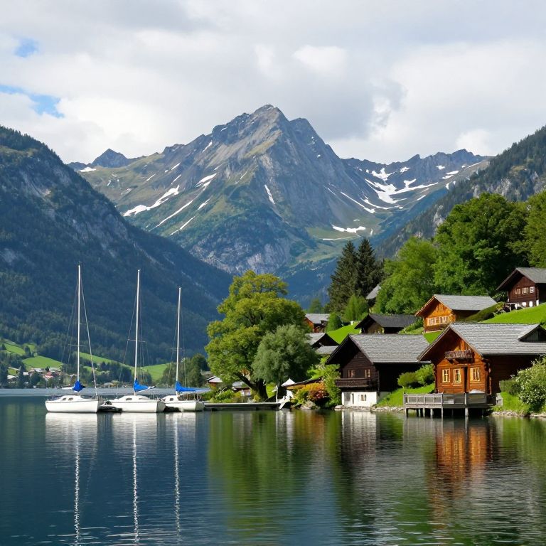 Titisee Lake reflects a serene alpine landscape, with three sailboats docked on the left, surrounded by lush green trees, while traditional wooden houses line the right shore, nestled against a backdrop of majestic mountains under a partly cloudy sky.