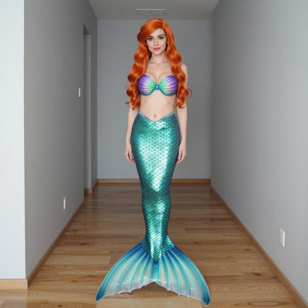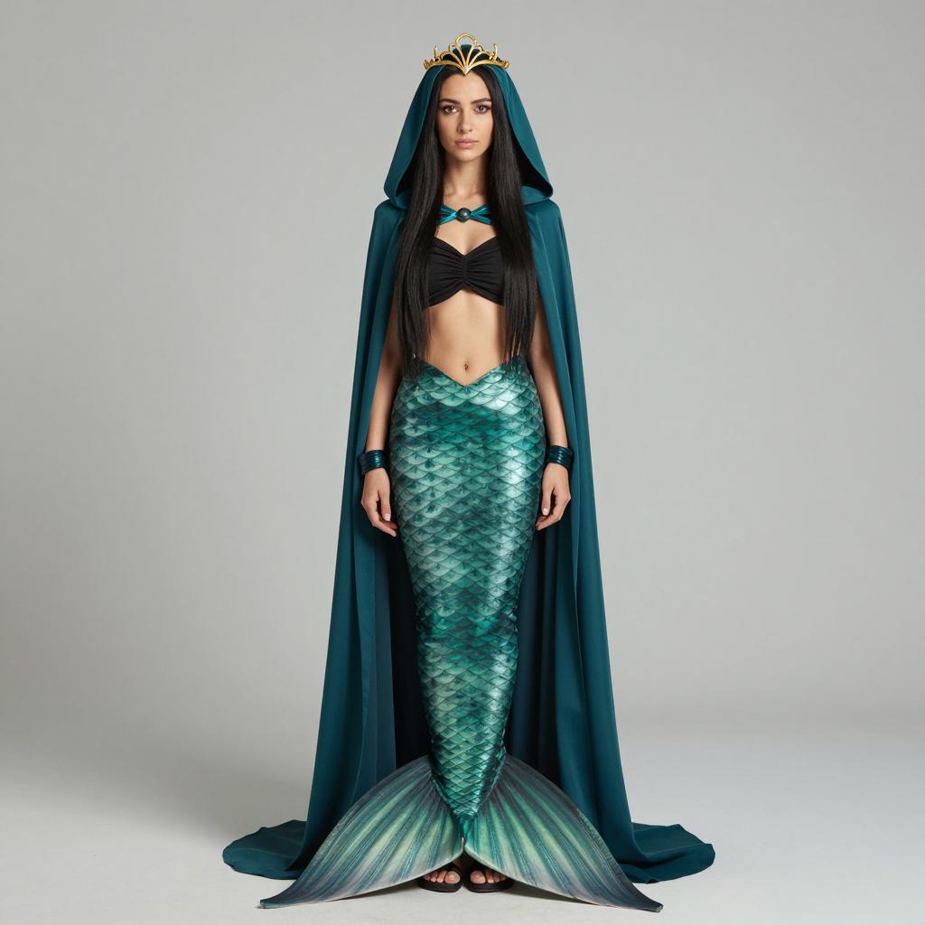 Mysterious mermaid costume, photograph of a woman, fantasy cosplay, mermaid outfit, teal and black, full-body shot, standing, neutral background, long teal hooded cloak with intricate gold crown, black mesh sleeveless top, green and black patterned mermaid tail, teal flowing fabric, dark arm cuffs, teal wristbands, black sandals, long straight black hair, serious expression, realistic style, soft lighting, centered composition