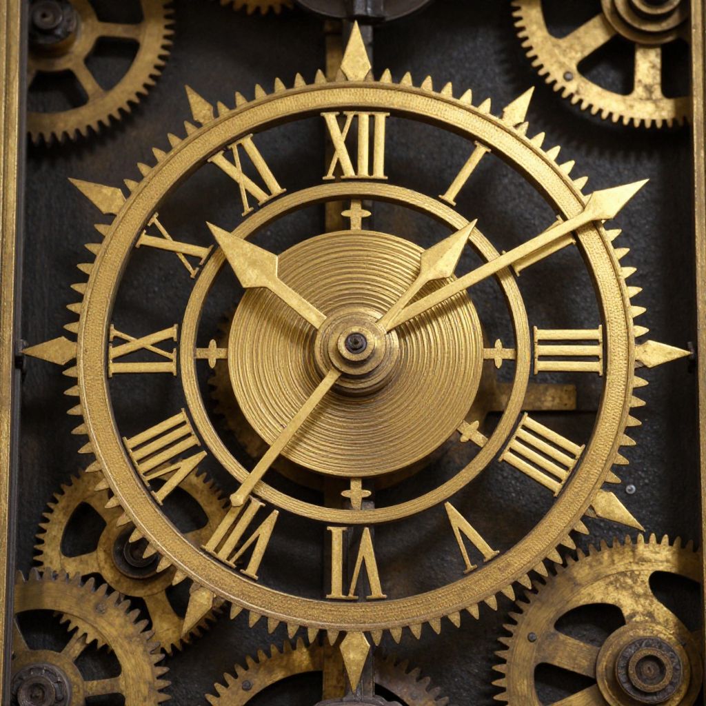 Golden clockwork intricately woven with Roman numerals and four spindly arms, each tipped with sharp points, stands as a timeless artifact against a backdrop of aged metal and ornate gears, symbolizing the eternal dance of time.