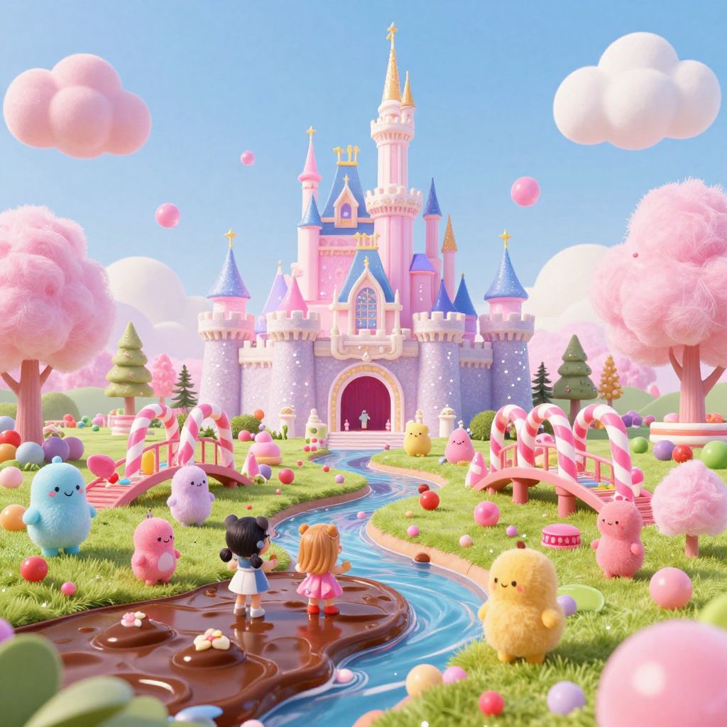 Whimsical digital illustration of a colorful castle with pink cherry blossoms, candy-themed landscape, a winding chocolate river, and adorable pastel-colored creatures