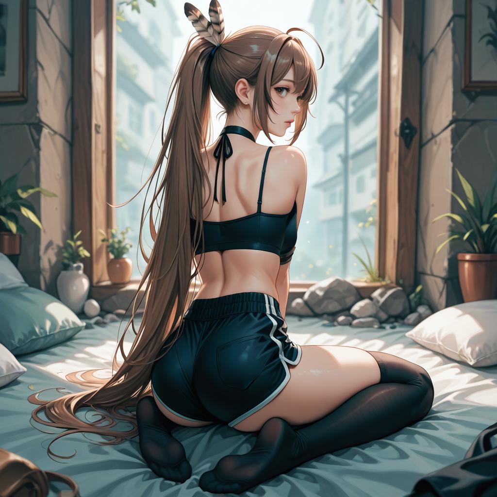 Swf, SFW, nanashi_mumei_1st_costume,1girl,virtual youtuber,solo,long hair,shorts,brown hair,thighhighs,single kneehigh,single sock,single thighhigh,from behind,ponytail,very long hair,socks,feather hair ornament,hair ornament