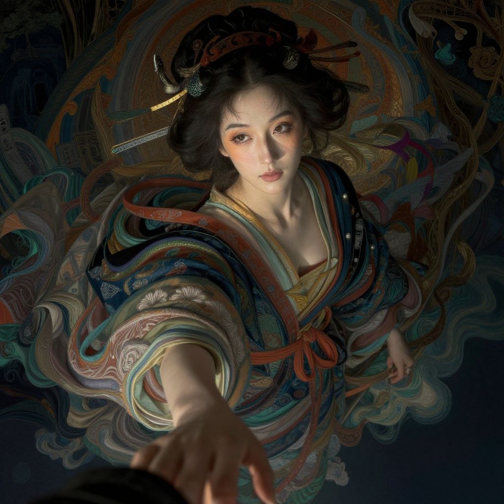Digital painting of an Asian woman with flowing black hair, wearing a colorful, patterned kimono, extending her hand forward in a mystical, swirling dark