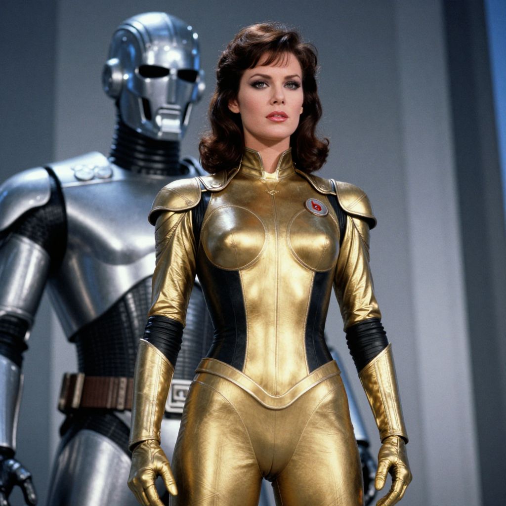 Photograph of a brunette woman in a shiny gold and black futuristic bodysuit, standing in front of a silver humanoid robot.