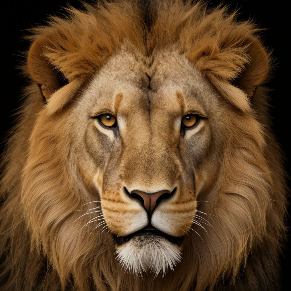 Photorealistic close-up of a majestic male lion with intense amber eyes, thick golden-brown mane, and dark background, highlighting its regal presence