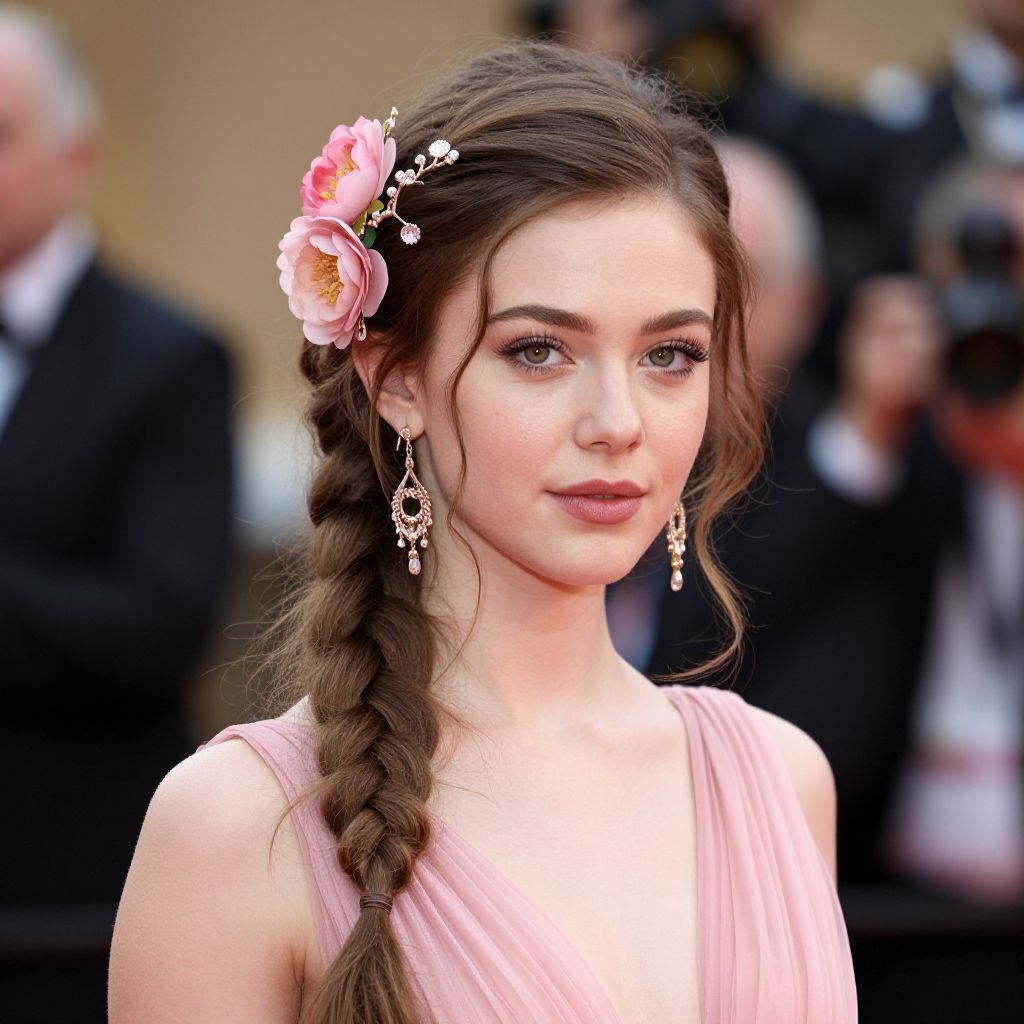 Photograph of a young woman with fair skin and brown hair styled in a long, loose braid adorned with pink flowers and small white beads. She wears a light pink, sleeveless, floor-length gown and elegant, dangling earrings. Her makeup is natural, with subtle eyeliner and pink lipstick. The background is blurred, featuring indistinct figures in formal attire, suggesting a red-carpet event. The lighting is soft, highlighting her serene expression and delicate features. The overall style is glamorous and sophisticated.