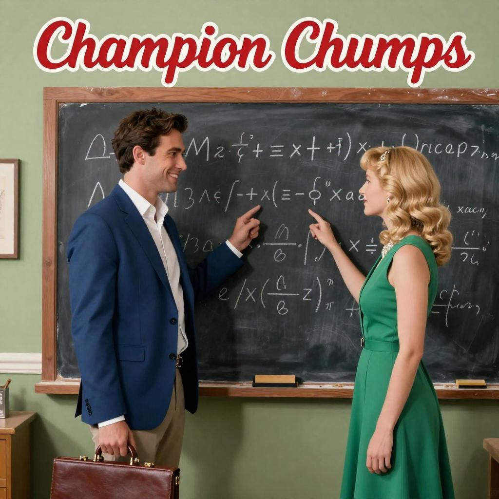 Photograph of two people, a man and a woman, in front of a chalkboard filled with mathematical equations. Man in blue suit, dark hair, smiling, holding briefcase. Woman in green dress, blonde hair, pointing at chalkboard. Background includes green walls and framed picture. "Champion Chumps" in red at top. Bright, vintage style.