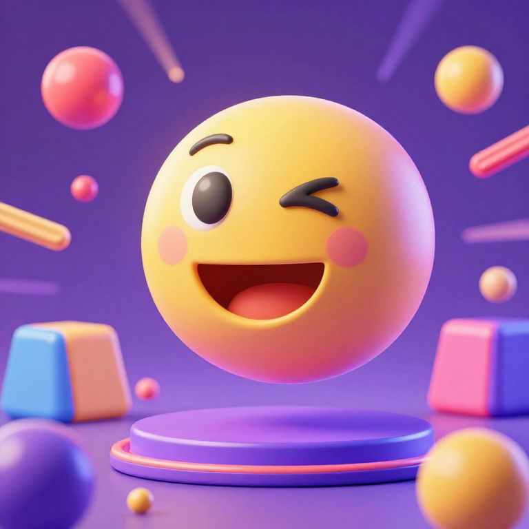 This digital CGI image features a cheerful, yellow, spherical emoji with a wide, open-mouthed smile and one winking black eye, set against a vibrant, purple background. The emoji is mounted on a purple circular pedestal. Surrounding the emoji are various colorful geometric shapes, including pink, orange, and blue cubes and spheres, all floating in mid-air. The background has a dynamic, energetic feel with blurred, neon lines radiating from the emoji, enhancing the playful, whimsical atmosphere. The image uses bright, saturated colors and smooth, glossy textures, giving it a modern, cartoonish style.