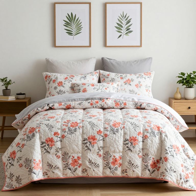 Cozy floral bedding featuring a coral and gray patterned quilt rests atop a neatly made bed, complemented by matching pillows and framed botanical artwork above, creating a serene and inviting bedroom ambiance.