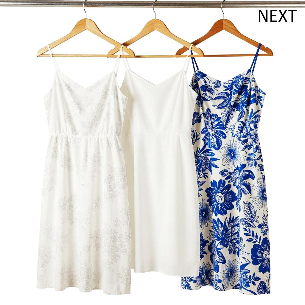 Photograph of three white dresses hanging on wooden hangers against a white background. The dresses vary slightly in design: the left one is plain white with subtle blue floral patterns, the middle one is solid white, and the right one features a bold blue and white floral print. The word "NEXT" is visible at the top right.