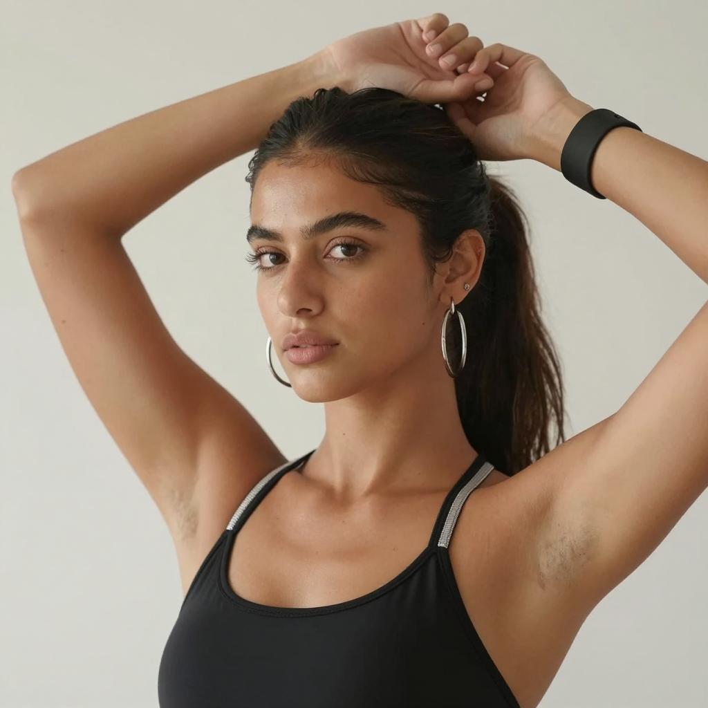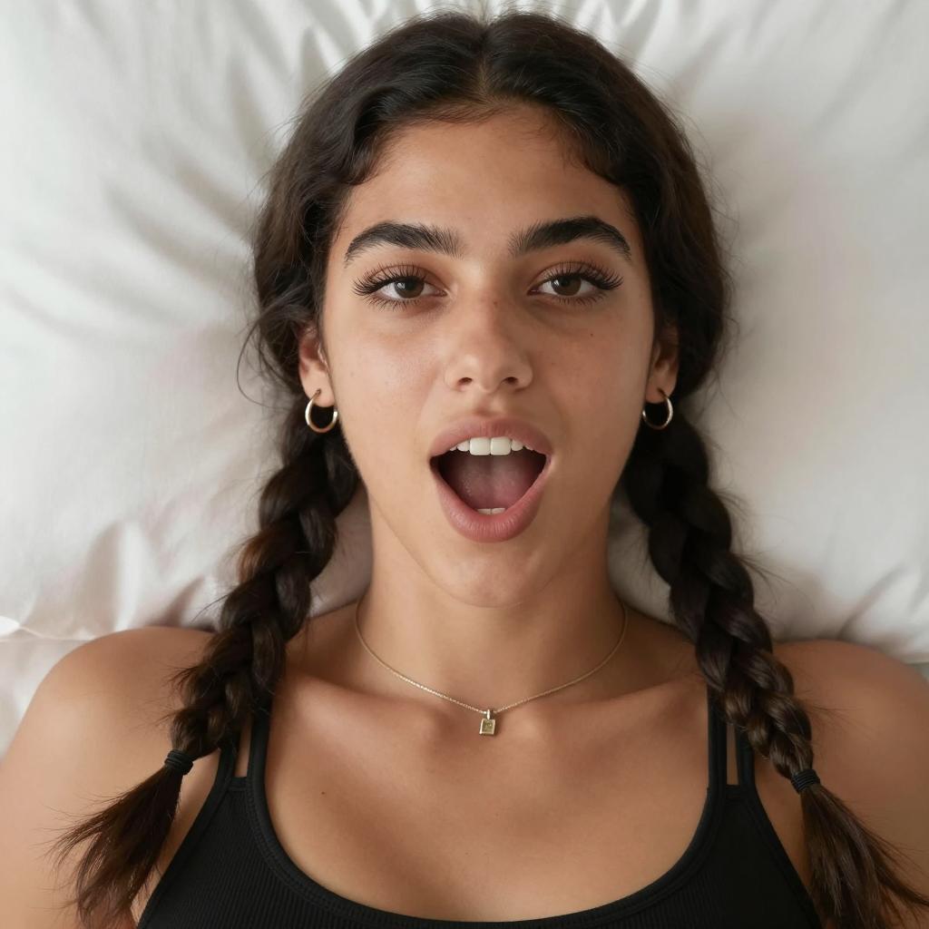 Photograph of a woman with dark hair in two braids, brown skin, thick eyebrows, long eyelashes, open mouth with teeth showing, wearing a black tank top, lying on a white pillow, small hoop earrings, necklace with a small pendant.