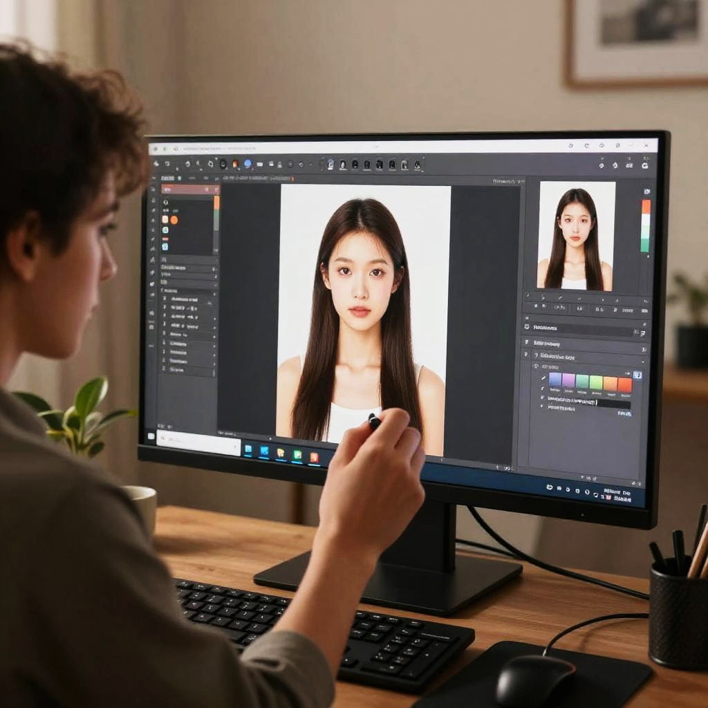 AI photo background changer free usage scenario, professional photographer editing portraits on a desktop, warm cozy studio setting, multiple screens showing different background options, precise brush tools active, natural and studio lighting highlights, realistic photo textures and immersive environment