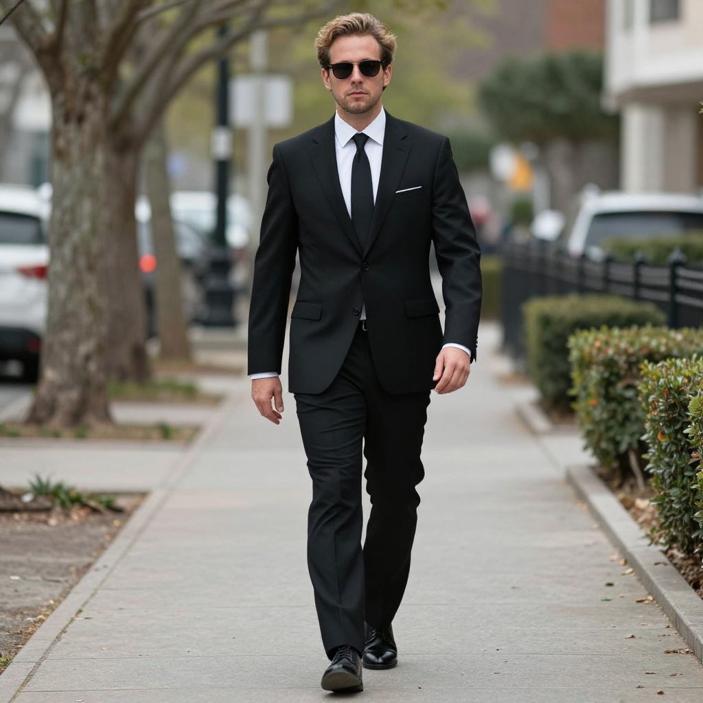 Photograph of a tall, handsome man in a black suit, white shirt, black tie, and sunglasses, walking confidently on a city sidewalk.