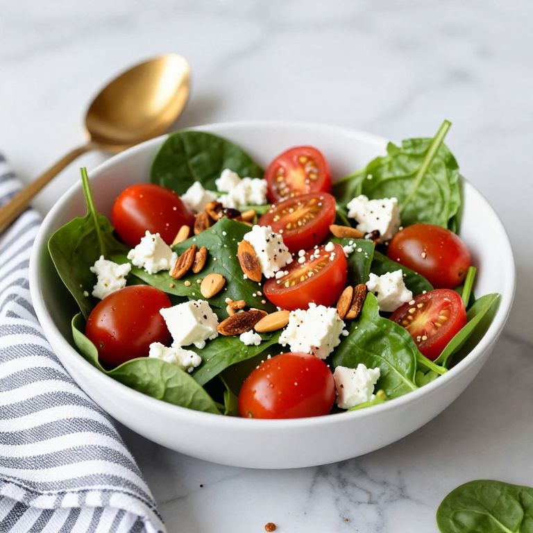 Fresh spinach salad served in a white bowl, topped with vibrant cherry tomatoes, crumbled feta cheese, and toasted almonds, accompanied by a golden spoon and a striped napkin on a marble countertop.