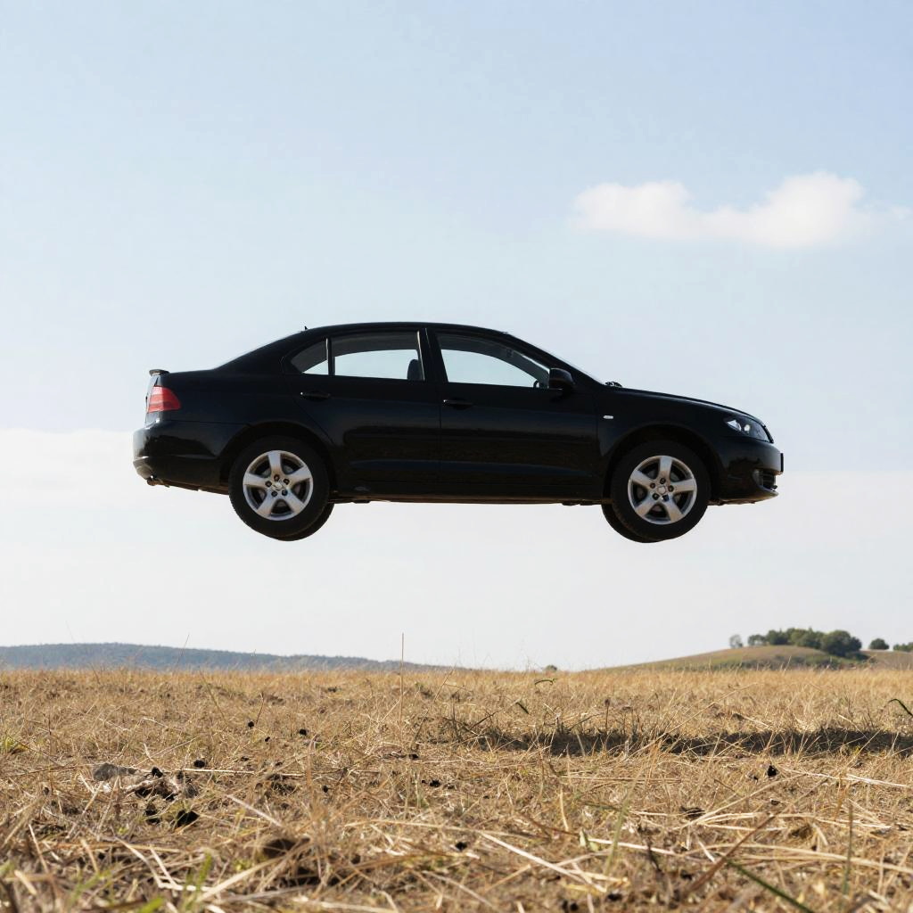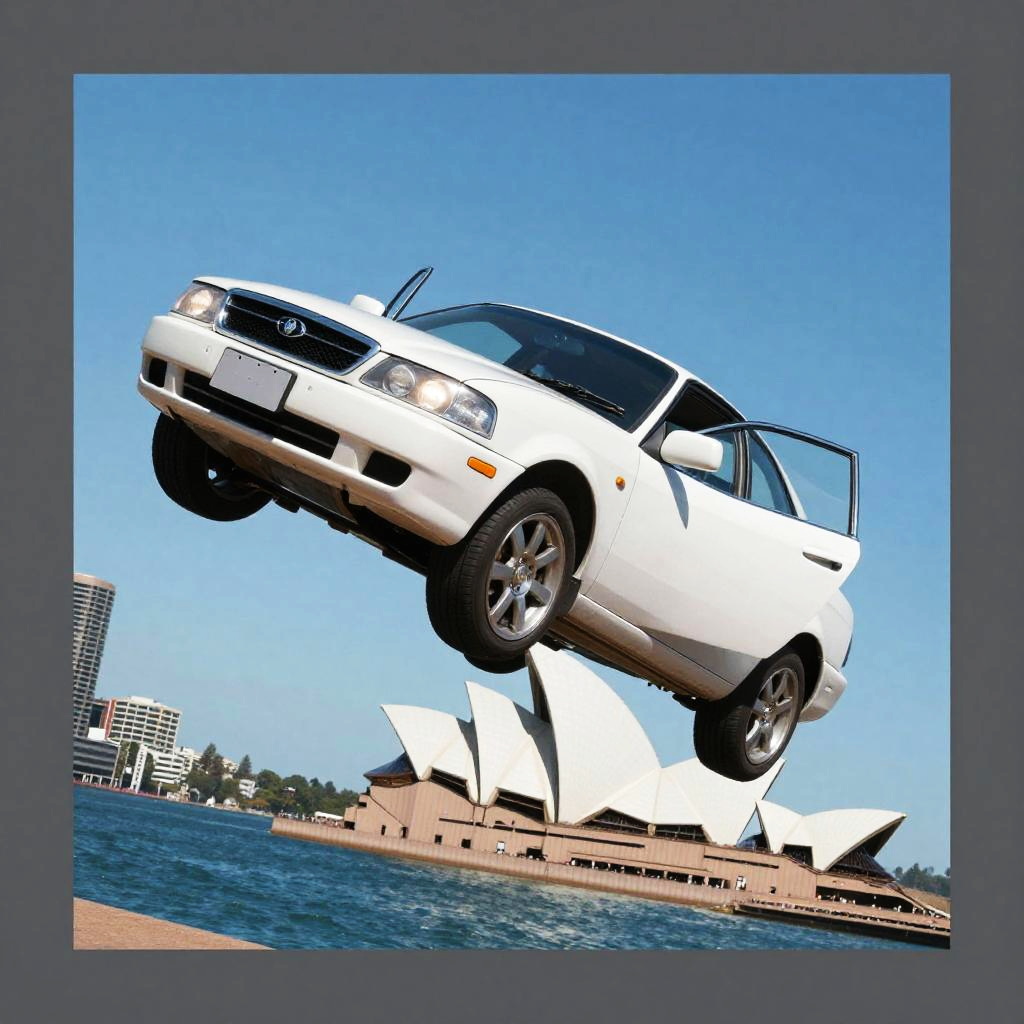Mid-Air White Car Over Sydney Cityscape