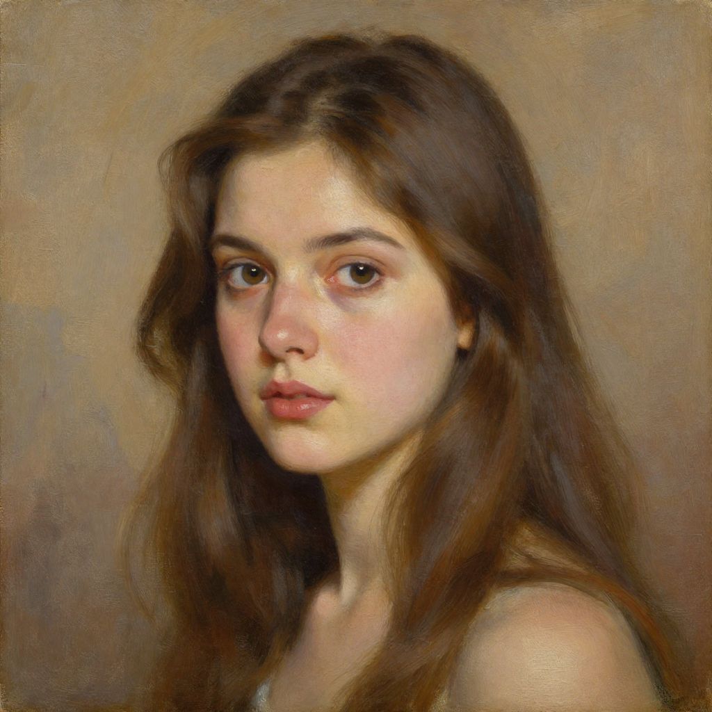 This image features a realistic oil painting portrait of a young woman with long brown hair and a focused expression. The warm tones and textured brushstrokes create a classic and intimate atmosphere, highlighting the elegance and natural beauty of the subject.