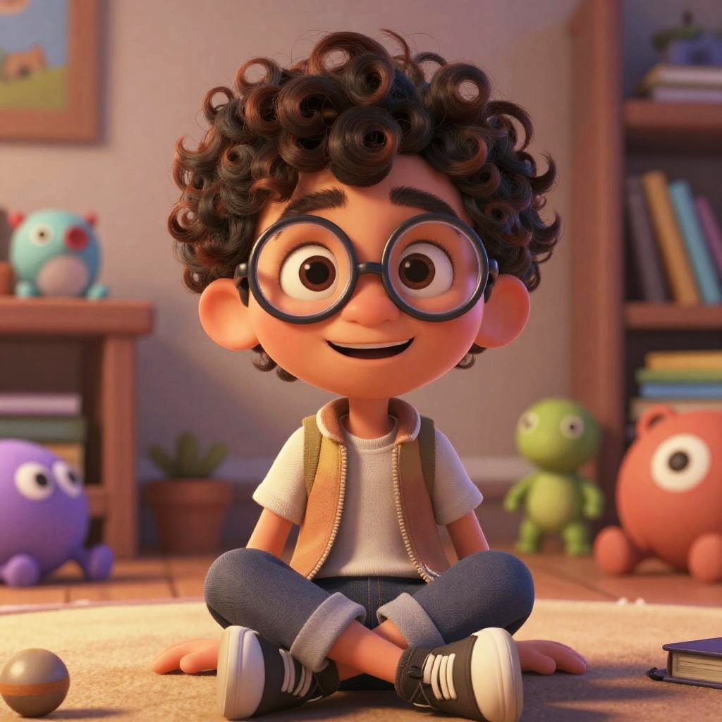 Create Pixar avatar featuring a cheerful boy with curly hair and round glasses, wearing casual modern clothes, sitting in a cozy room filled with toys and books, rendered in bright, warm colors and detailed Pixar animation style.