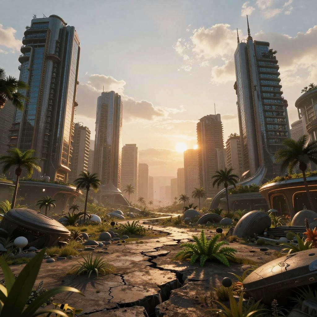 AI generated landscape portraying a post-apocalyptic world reclaimed by nature, with skyscrapers entwined with giant vines, mist-covered hills, and a glowing sunset casting warm light over futuristic remnants, combining realism with imaginative sci-fi decay.