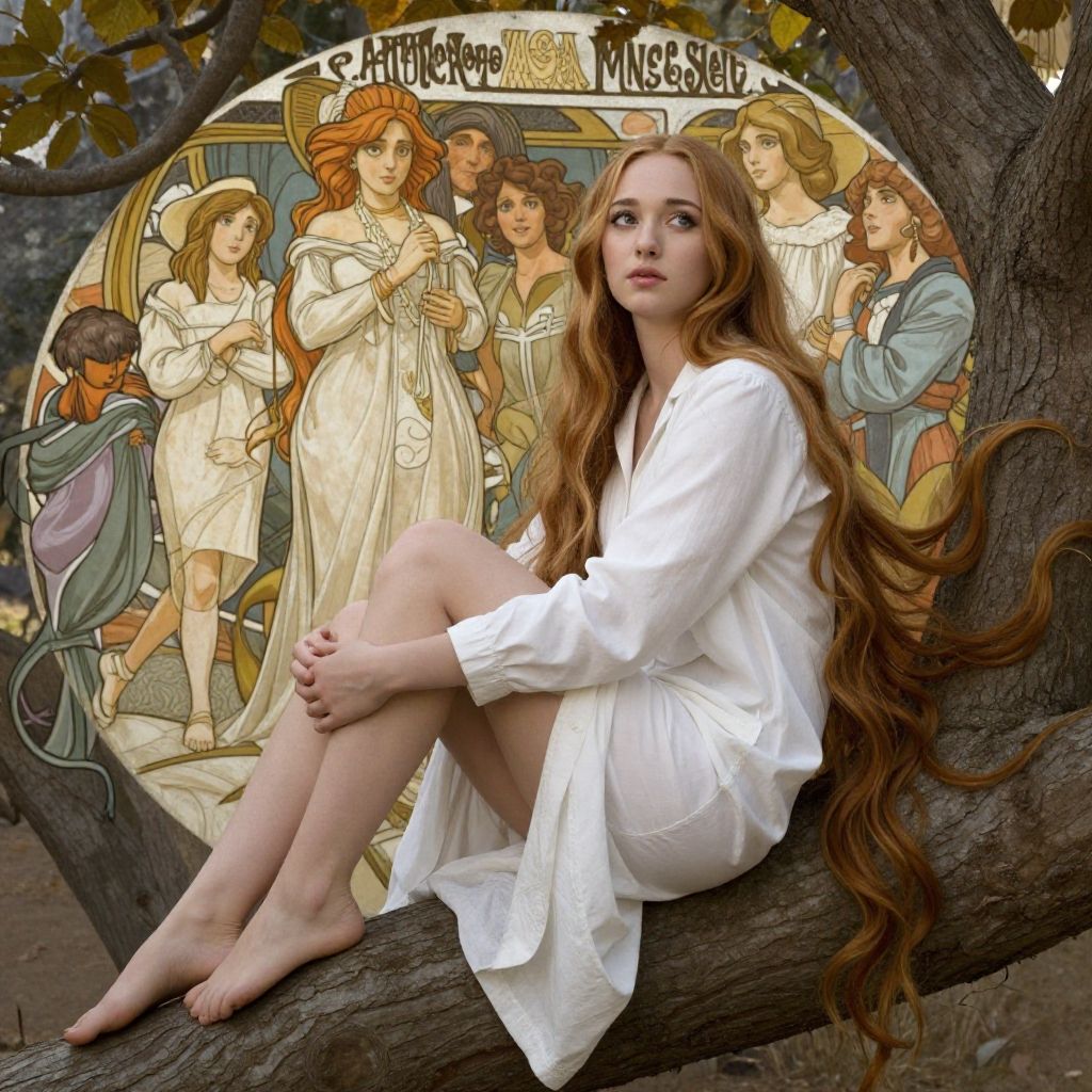 A 25 year old woman sitting on a tree branch in a park with her legs crossed and her head tilted back, looking to the side, amanda seyfried, portrait photography, a picture, american barbizon school masterpiece, best quality, intricate detail, 8k, golden ratio, cinematic lighting, a full portrait of a medieval woman, highly detailed, digital painting, artstation, concept art, smooth, sharp focus, illustration, art by greg rutkowski and alphonse mucha, beautiful young woman, long flowing hair, symmetrical face, perfect eyes, white pyjama coat, detailed drawing, trending on artstation, by jeremy lipking, by makoto shinkai and hiroya oku, by akihiko yoshida, by greg tocchini and james gilleard, by joe fenton, by kaethe butcher, by louis comfort