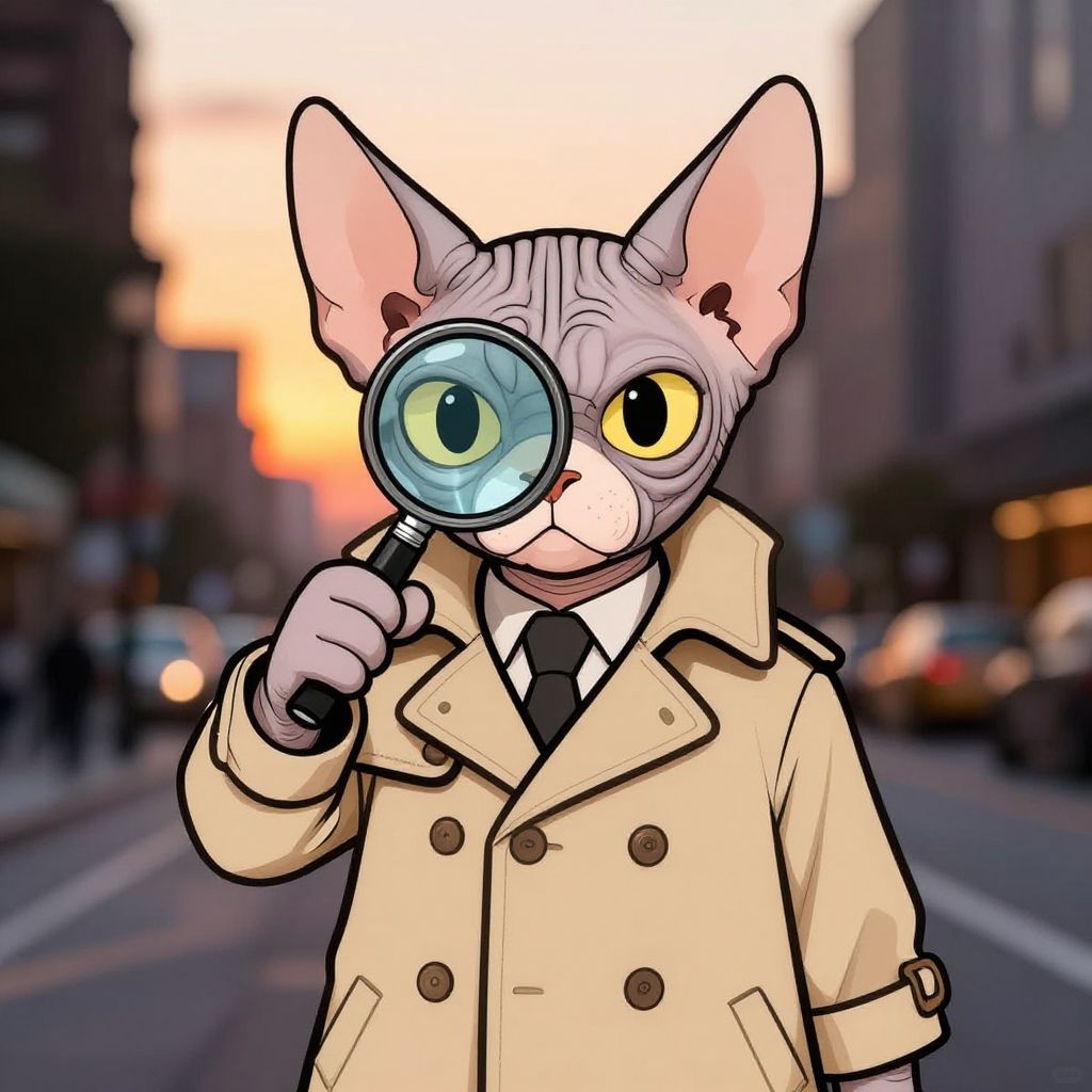 Hairless cat cartoon depicted as a mischievous detective wearing a tiny trench coat and magnifying glass, detailed line art style, city streets background at sunset