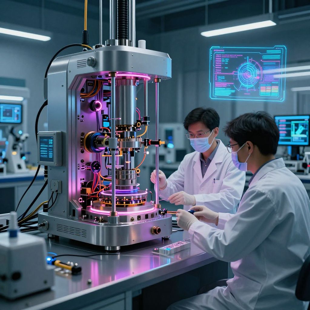 Photograph of two Asian male scientists in white lab coats and face masks, working in a high-tech laboratory. They are focused on a large, cylindrical, metallic machine illuminated with pink and purple neon lights, displaying intricate internal components. The background features a neon blue holographic display and multiple computer monitors. The lab is equipped with sleek, modern equipment and has a sterile, industrial atmosphere with bright, fluorescent lighting. The scientists are positioned on the right, with one gesturing towards the machine.