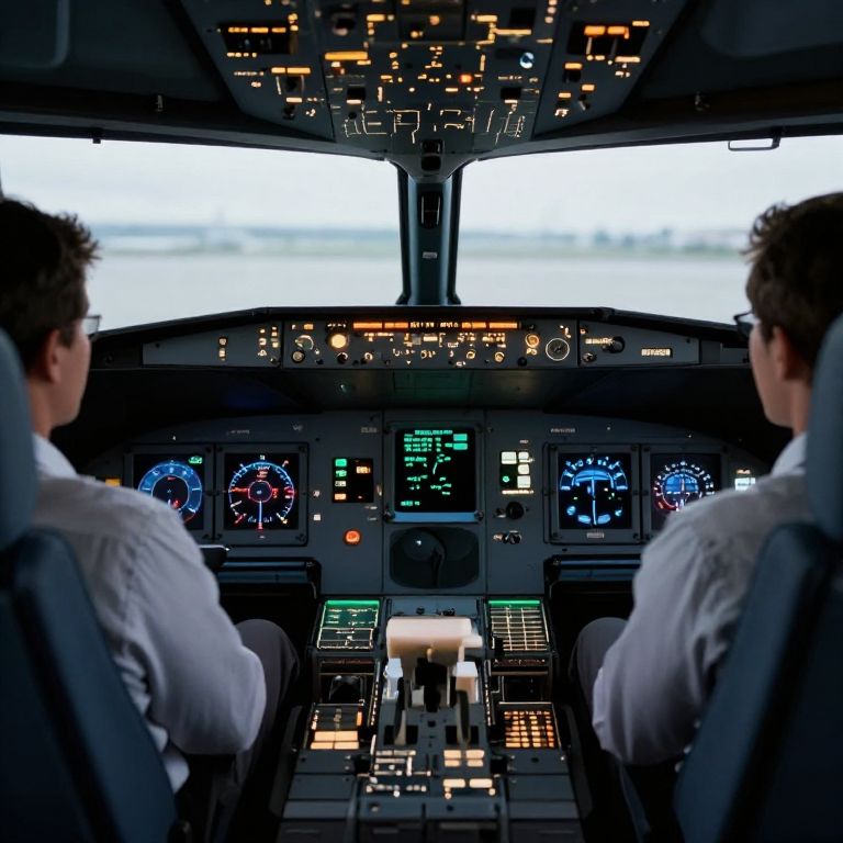 Photograph of a cockpit with two male pilots, seen from behind, wearing light gray dress shirts. The cockpit is filled with an array of illuminated control panels, dials, and screens displaying various blue, green, and orange indicators. The pilots are seated in dark gray seats, with their hands resting on the control yoke and throttle levers. The background outside the cockpit is a blurred, overcast sky. The overall scene is highly technical, with a focus on the intricate cockpit instruments and the pilots' focused posture.