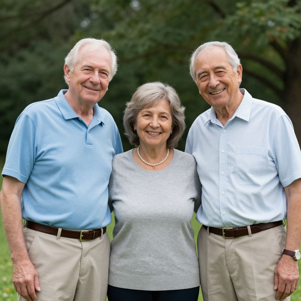 Three smiling senior citizens stand together outdoors, with two men flanking a woman in the center, all wearing casual attire and exuding warmth and camaraderie against a lush green backdrop.